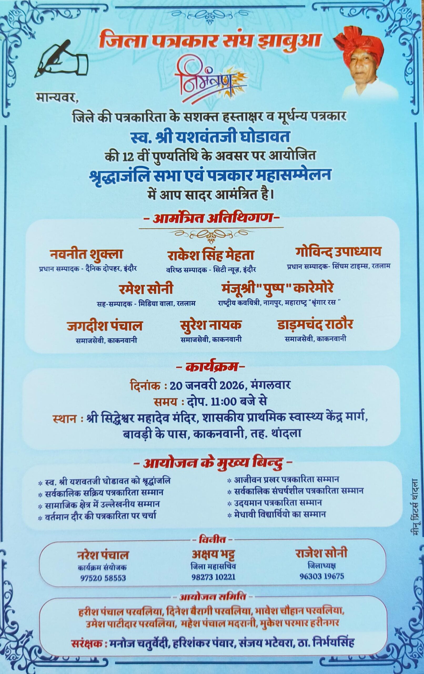 जिला पत्रकार संघ झाबुआ की काकनवानी व परवलिया इकाई के तत्वावधान में आगामी 20 जनवरी 2026, मंगलवार को जिले के मूर्धन्य पत्रकार स्व. श्री यशवंतजी घोडावत की 12वीं पुण्यतिथि के अवसर पर एक श्रद्धांजलि सभा एवं पत्रकार महासम्मेलन का आयोजन होगा। यह आयोजन थांदला तहसील के काकनवानी में बावड़ी के पास स्थित श्री सिद्धेश्वर महादेव मंदिर मार्ग पर दोपहर 11 बजे से संपन्न होगा।