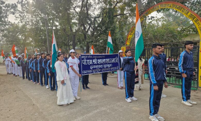26 जनवरी गणतंत्र दिवस के अवसर पर नगर में पीएम श्री विद्यालय परिवार झकनावदा में नन्हे मुन्हें बच्चों द्वारा नगर के प्रमुख मार्गो से होते हुवे एक भव्य तिरंगा प्रभात फेरी निकाली गई जिसमें नन्हे मुन्हें बच्चों द्वारा देश भक्ति के जयघोष लगाकर ,देश भक्ति वस्त्र धारण कर अति उत्साही होकर सच्ची देश भक्ति जाहिर की। तत्पश्चात तिरंगा प्रभात फेरी पीएम श्री स्कूल प्रांगण में पहुंची जहां पर विद्यालय परिवार के द्वारा कार्य क्रम में पधारे समस्त अतिथियों द्वारा मां शारदा के चित्र पर माल्यार्पण ,दीप प्रज्वलित कर श्री गणेश किया गया। कार्यक्रम के मुख्यअतिथि जनपद पंचायत उपाध्यक्ष बहन देवकुवर पडियार, कार्यक्रम की अध्यक्षता कर रहे भाजपा मंडल अध्यक्ष जितेंद्र राठौड़,विशेष अतिथिगण पूर्व सांसद प्रतिनिधि राजेश कासवा, भाजपा मंडल उपाध्यक्ष ठाकुर परीक्षित सिंह राठौर, पालक शिक्षक संघ अध्यक्ष फकीर चंद माली, ग्राम पंचायत सचिव विनोद देवदा, वरिष्ठ भाजपा नेता मांगीलाल पड़ियार, पूर्व सरपंच बालू मेडा, जूनियर इंजीनियर गुर्जर साहब, वरिष्ठ पत्रकार संजय व्यास का संस्था द्वारा गले में दुप्पटा पहनाकर स्वागत अभिनंदन किया गया।