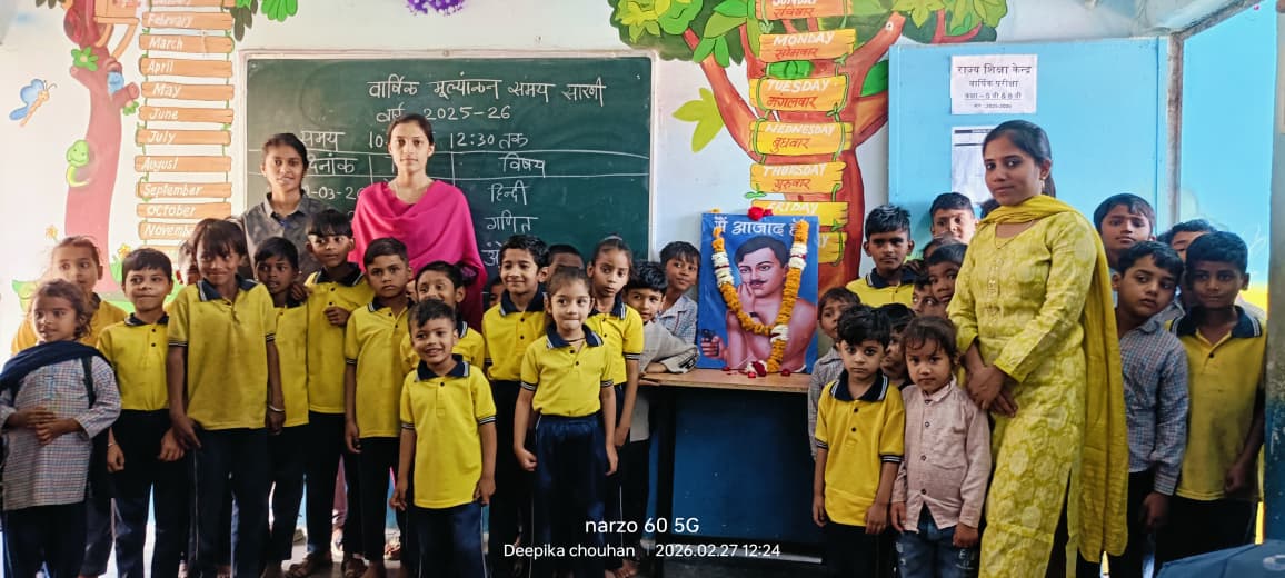 संकुल प्राचार्य रमेश कुमार चौरसिया द्वारा शहीद चंद्रशेखर आजाद जी से संबंधित स्मरण ओर मातृभूमि की स्वतन्त्रता प्रति अद्वितीय साहस और अटूट दृढ़ संकल बच्चों को बताया गया उनके जैसे देश सेवा के लिए सदैव तैयार रहने की प्रेरणा दी गई इस अवसर पर उपस्थित शत्रुघ्न मालवीय,कैलाश कटारा, संदीप पाटीदार ,रिंकू पवार, श्री मति मोनू सोलंकी, दीपिका चौहान, श्री मति आरती मिस्त्री, हर्षिता चोयल, सोनू चौहान,रूपाली बैरागी,शीतल गोस्वामी,ज्योति गहलोत, पूजा कटारे आदि शिक्षक जन उपस्थित रहे।