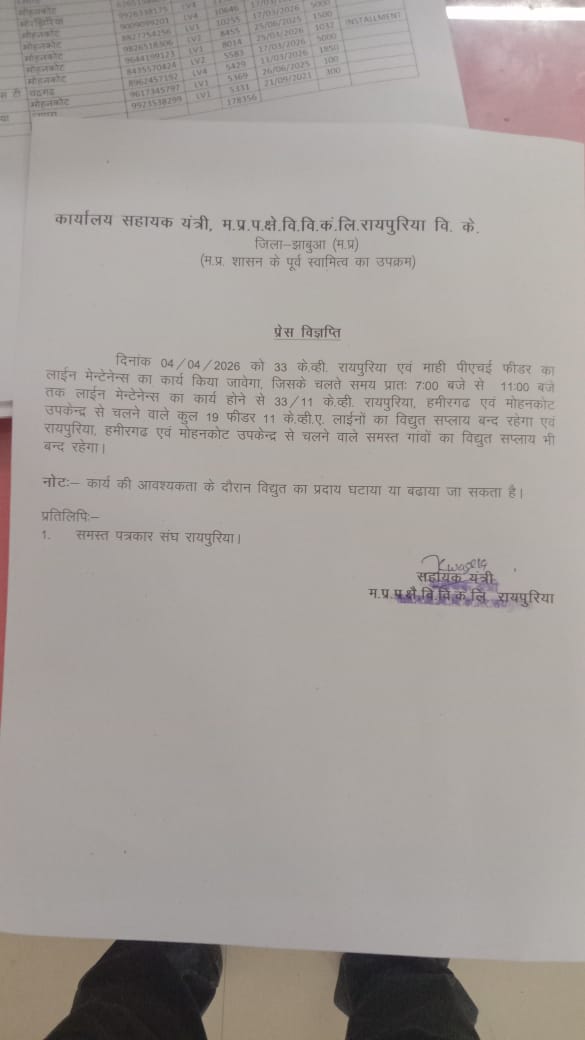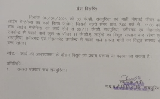 रायपुरिया डेस्क। 33 के. व्ही. रायपुरिया एवं माही पीएचई फीडर का लाईन मेन्टेनेन्स का कार्य किया जायेगा, जिसके चलते समय प्रातः 7:00 बजे से 11:00 बज तक लाईन मेन्टेनेन्स का कार्य होने से 33/11 के.व्ही. रायपुरिया, हमीरगढ एवं मोहनकोट उपकेन्द्र से चलने वाले कुल 19 फीडर 11 के.व्ही.ए. लाईनों का विद्युत सप्लाय बन्द रहेगा एवं रायपुरिया, हमीरगढ़ एवं मोहनकोट उपकेन्द्र से चलने वाले समस्त गांवों का विद्युत सप्लाय भी बन्द रहेगा।