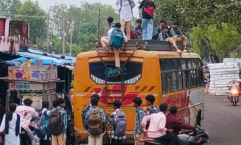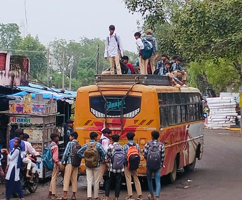 बच्चे बस की छतों पर बैठे हैं, कुछ गाड़ियों के किनारों और पीछे लटककर सफर कर रहे हैं। जरा-सी चूक जानलेवा साबित हो सकती है, लेकिन प्रशासन आंख मूंदे बैठा है।