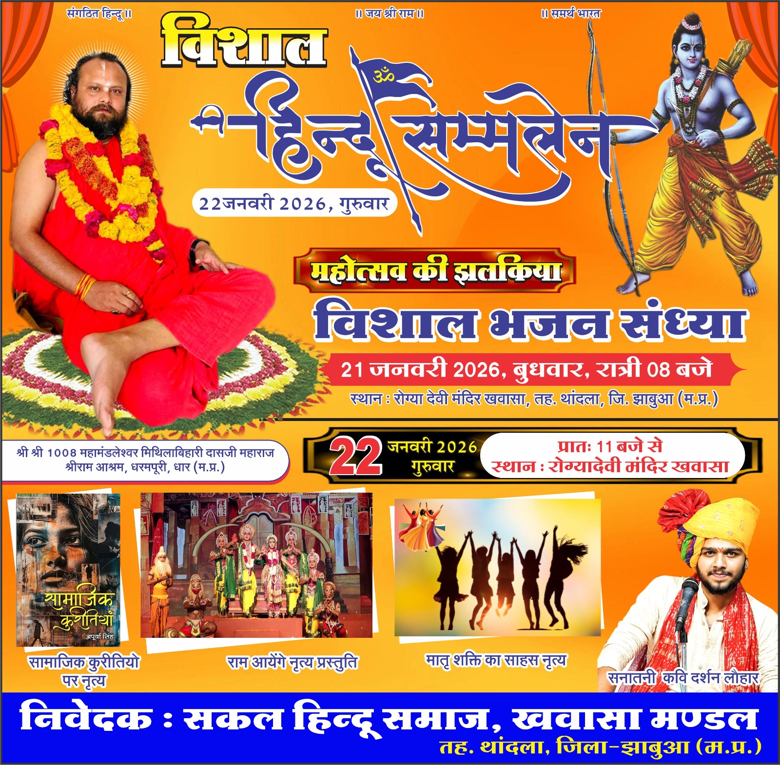 झाबुआ जिले के खवासा मंडल में सामाजिक चेतना, सांस्कृतिक गौरव और हिंदू एकता के संकल्प के साथ भव्य ‘विशाल हिंदू संगम’ का आयोजन होने जा रहा है। यह आयोजन केवल एक कार्यक्रम नहीं है, बल्कि समाज को जोड़ने वाला एक ऐसा महाअभियान है जहाँ श्रद्धा, उत्साह और समरसता का अद्भुत संगम दिखाई देगा। इस ऐतिहासिक कार्यक्रम को लेकर पूरे मंडल में जबरदस्त उत्साह है और खवासा बस स्टैंड स्थित हनुमान चौक पर भव्य तैयारियाँ जोरों पर चल रही हैं।
