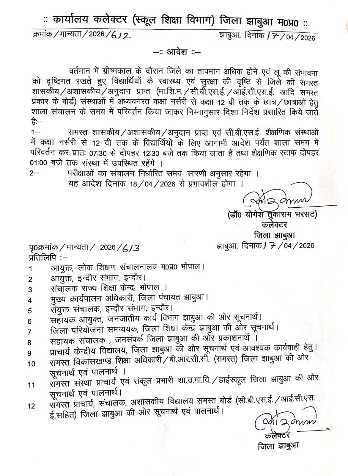 झाबुआ हलचल खबर का असर,,,गर्मी को देखते हुए कलेक्टर डॉ. योगेश तुकाराम भरसट ने लिया संज्ञान,,,18 अप्रैल से जिले के सभी स्कूलों का समय सुबह 7:30 से दोपहर 12:30 बजे तक किया गया,,,विद्यार्थियों की सुरक्षा को प्राथमिकता देते हुए यह निर्णय लागू किया गया।