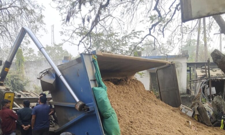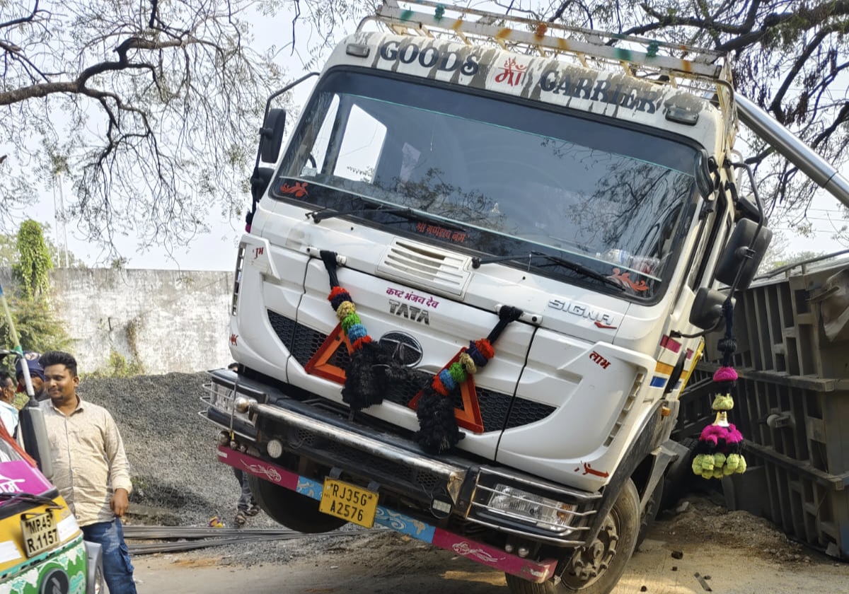 मेघनगर चौराहे पर रेत से भरा डंपर पलटा,,,,बड़ा हादसा टला….!