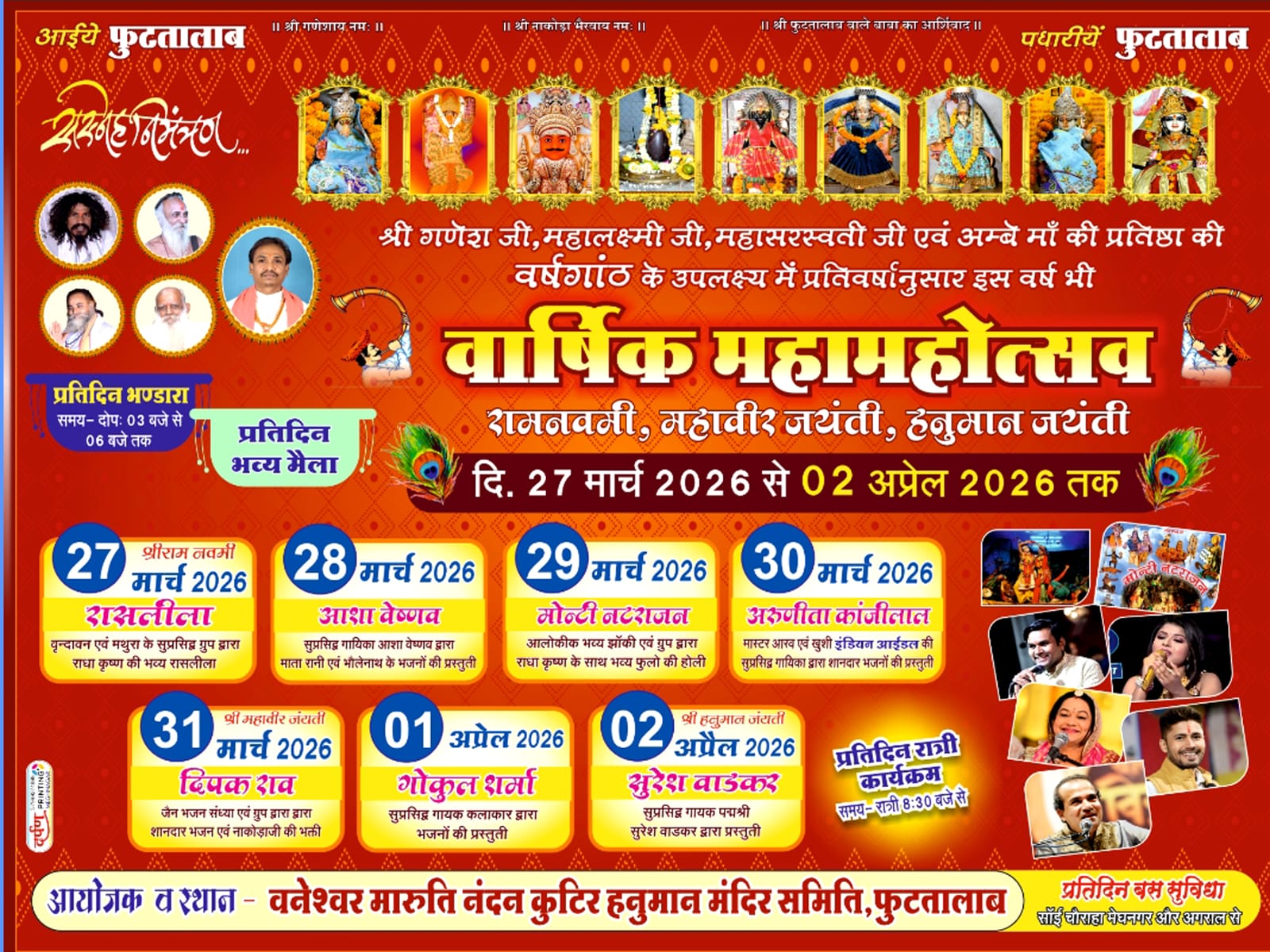 मेघनगर बृज की रासलीलाओं से होगा फुटतालाब हनुमान जयंती महोत्सव का श्रीगणेश….सुरेश वाडेकर आशा वैष्णव अरुणिका काँजीवाल सहित कई कलाकार देंगे प्रस्तुतियाँ….