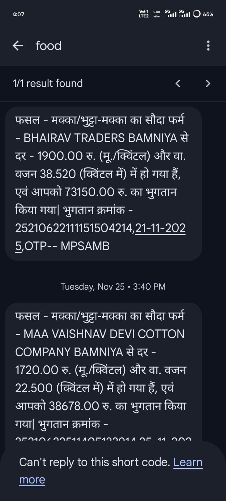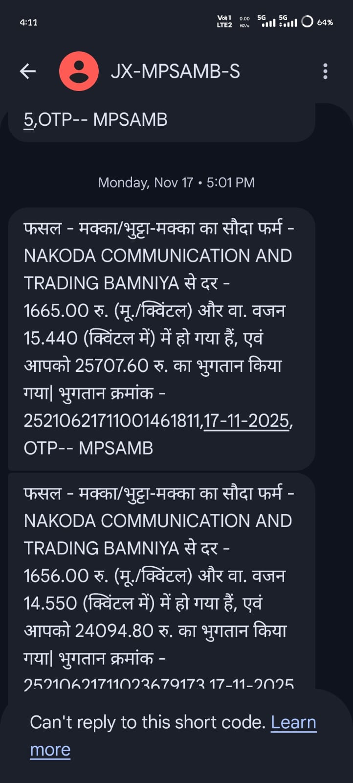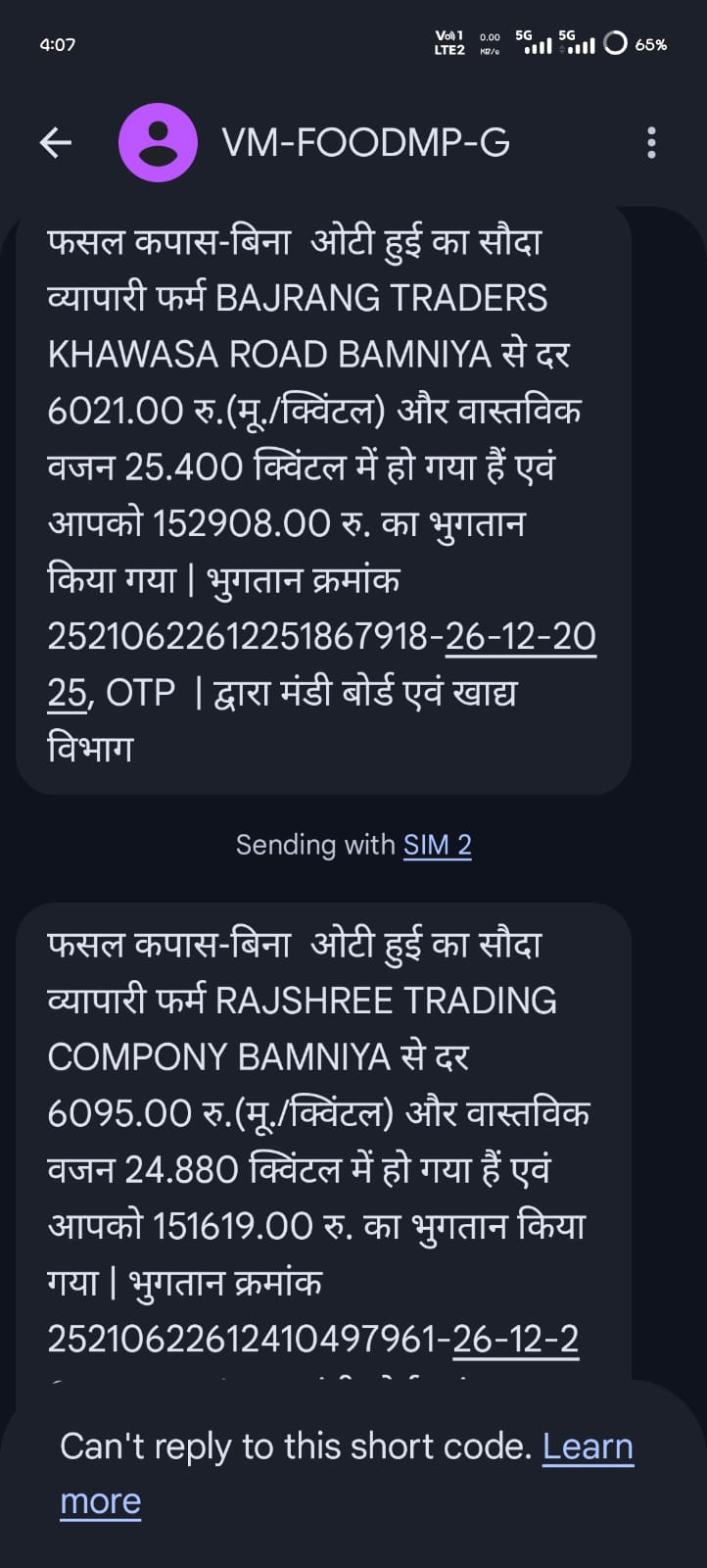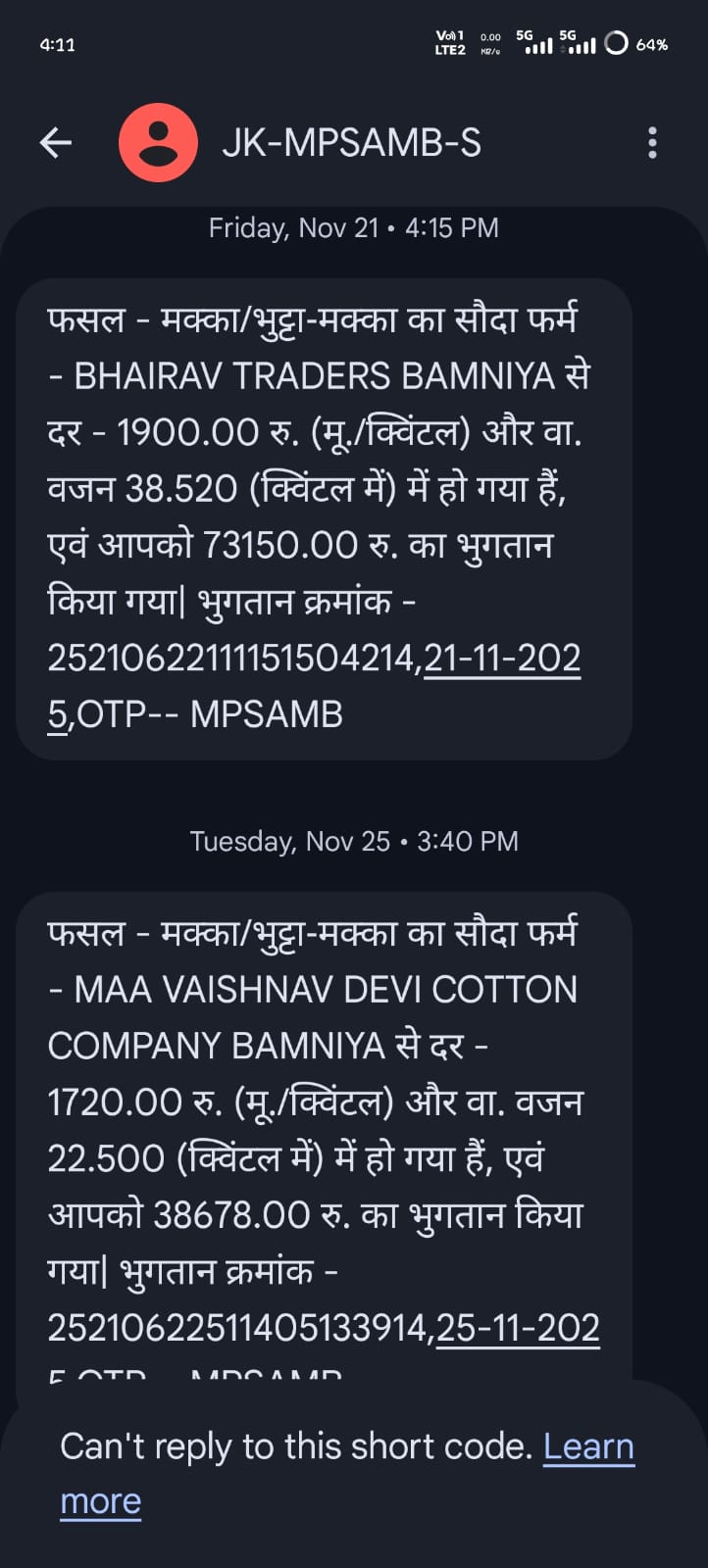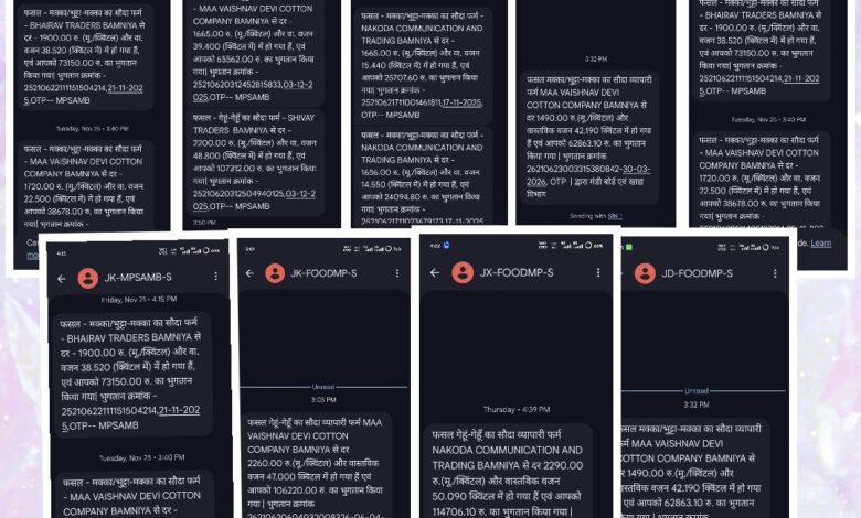बामनिया के समीप ग्राम सातेर निवासी कपिल सिनम ने बताया कि पिछले करीब एक वर्ष से उसके मोबाइल नंबर पर बामनिया अनाज मंडी से जुड़े मैसेज लगातार आ रहे हैं। इन मैसेज में वर्ष 2025 और 2026 के दौरान अलग-अलग फर्मों के नाम से लाखों रुपये के अनाज के कुंटलों की एंट्री दिखाई जा रही है, जबकि उसने एक किलो भी अनाज नहीं बेचा है।