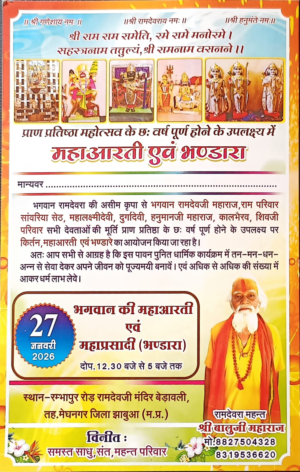 रामदेवरा मंदिर के महंत श्री बाबूलाल जी महाराज ने बताया कि 26 जनवरी को रात्रि में जनक रामायणी द्वारा भव्य सुंदर कांड पाठ का आयोजन होगा एवं 27 जनवरी को महाआरती महा प्रसादी एवं भंडारे का आयोजन रहेगा जिसमें श्री रामचरितमानस मंडल मेघनगर द्वारा रात्रि कालीन सुंदरकांड पाठ किया जायेगा रामायण मंडल के संस्थापक संजय श्रीवास एवं गणेश प्रजापत जगदीश पंडित दिनेश बैरागी आनंदीलाल पडियार राहुल अग्रवाल विक्रम बैरागी अशोक बंधु राकेश परिहार विनायक श्रीवास हार्दिक नंदेचा सतीश पाटीदार राम सिंह ठाकुर अरविंद दुबे हार्दिक पांचाल तुलसी राम पाटीदार आनंदीलाल तिवारी सुजान हाडा लखन देवाणा अल्पेश तिवारी राहुल मोदी दर्शन नायक गौरव प्रजापत अमन प्रजापत मनोज नायक अरुण मिस्त्री विपुल पांचाल पुनीत पांचाल बंटी कहार धनंजय सोनी प्रज्वल सोनी विकास परिहार नितेश श्रीवास नरेंद्र राठौड़ एवं सभी सदस्यों ने धर्म का लाभ लेने की अपील की है।