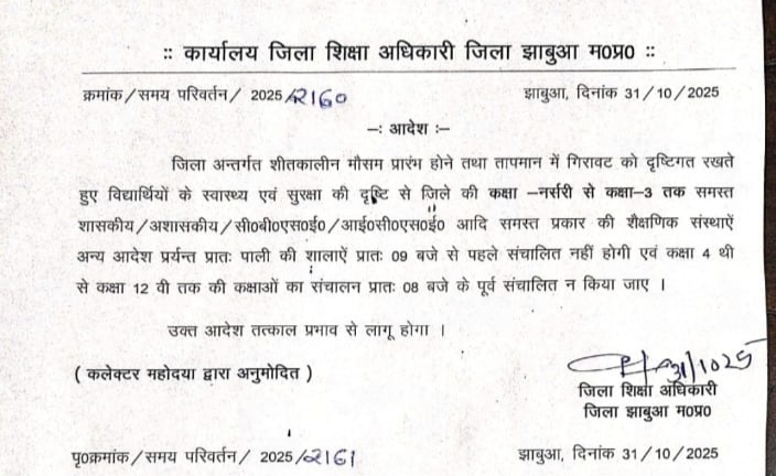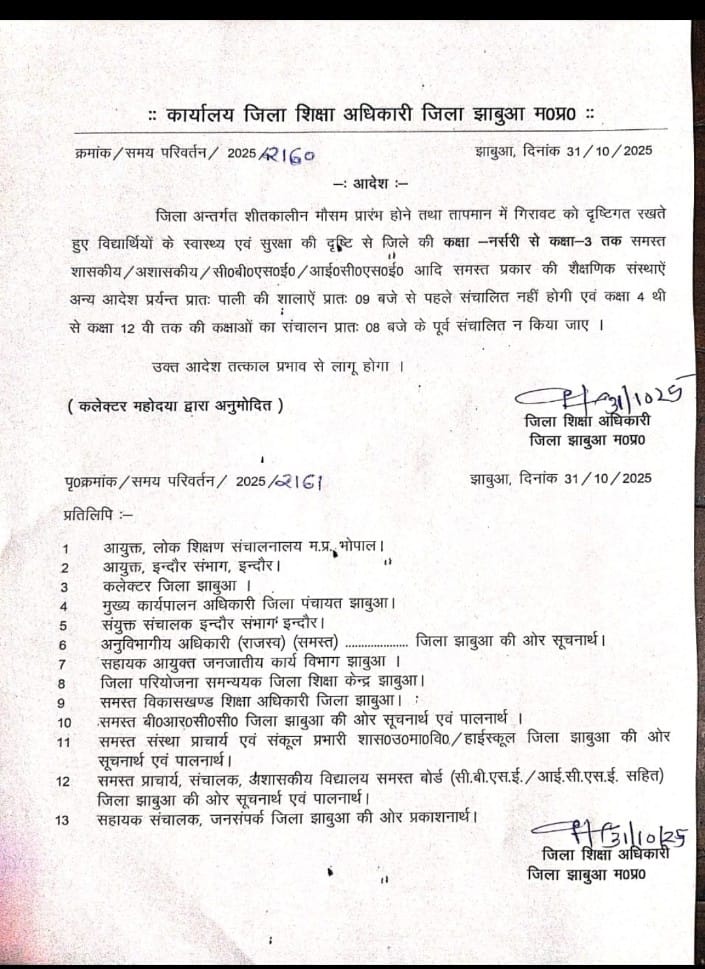 जिला शिक्षा अधिकारी झाबुआ द्वारा जारी निर्देशानुसार शीतकालीन मौसम के आगमन को ध्यान में रखते हुए जिले के सभी प्राथमिक, माध्यमिक, उच्च व उच्चतर माध्यमिक विद्यालयों के प्रातः पाली के समय में परिवर्तन किया गया है।